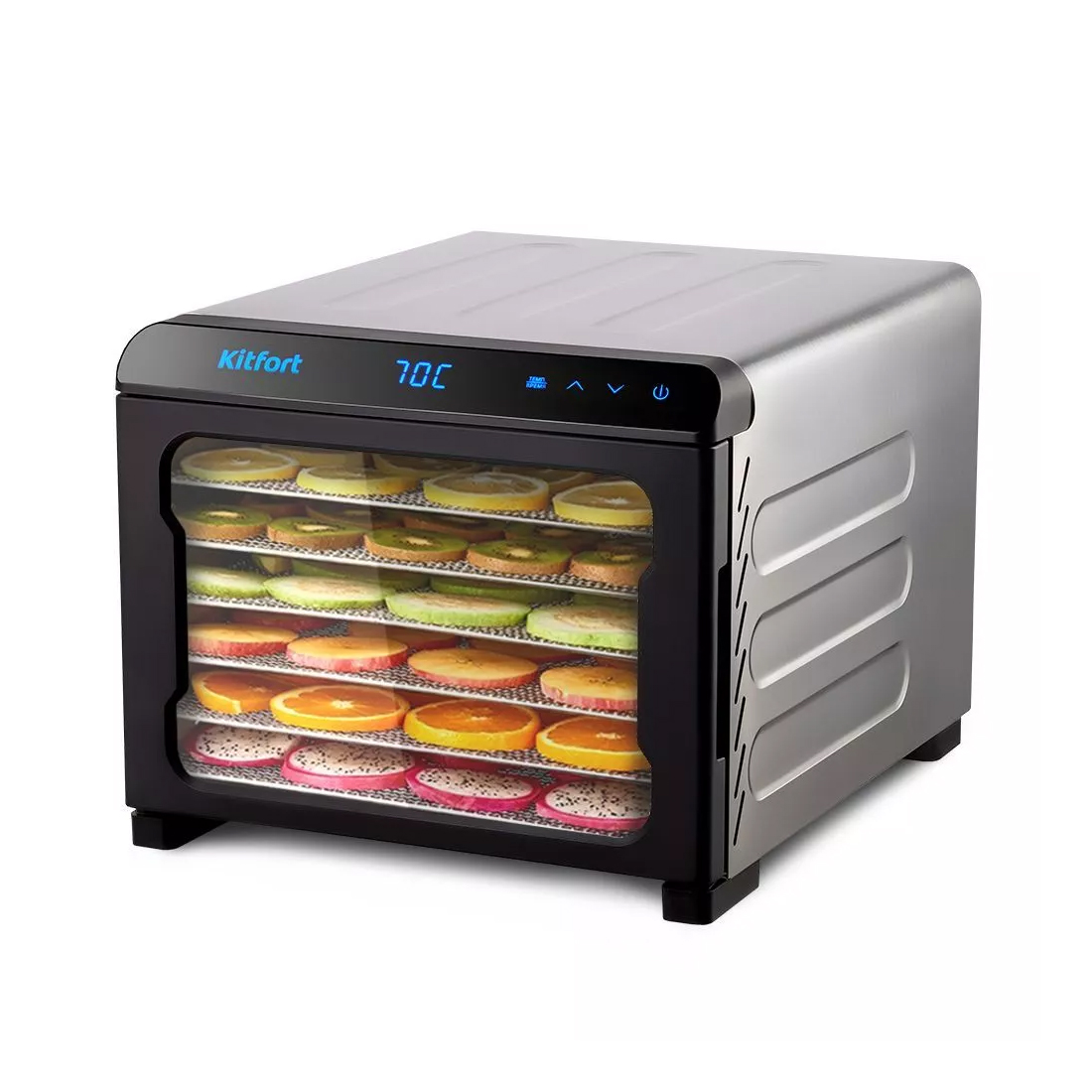 Всё, что пожелаете: жарка, запекание, выпечка, сушка! Стильный, большой и мощный аэрогриль Kitfort КТ-2236 является универсальным устройством, и совмещает в себе функции аэрофритюрницы, духовки, шашлычницы или даже сушилки для овощей и фруктов! Накормит всю семью! Вместительных размеров аэрогриля хватит, чтобы накормить всю семью! Готовьте мясо, птицу, рыбу, морепродукты, овощи, разнообразную выпечку или пиццу. Аэрогриль обладает мощностью 1800 Вт, благодаря чему приготовление не займёт много времени. Все необходимое для кулинарных экспериментов уже в комплекте! В комплекте к аэрогрилю идут сетка и сетчатый противень для приготовления или сушки продуктов, вертел с вилками для приготовления курицы-гриль или больших порций мяса, шампуры для шашлыка, вращающаяся корзина и специальный поддон для сбора жидкости. Сенсорное управление Аэрогриль оснащён сенсорным управлением, имеет 8 автоматических программ и программу с настройками вручную, где вы можете сами настроить время приготовления от 1 до 60 мин с шагом 1 мин и температуру от 75 до 200 °C с шагом 5 °C. Равномерное приготовление Благодаря системе циркуляции горячего воздуха, продукты обжариваются равномерно со всех сторон и получаются нежными внутри и с хрустящей корочкой снаружи. Лёгкая очистка Аэрогриль удобно чистить после готовки, благодаря доступу внутрь устройства. В камере аэрогриля находится лампочка, которая подсвечивает её изнутри, что делает чистку ещё более лёгкой и эффективной. Для вашей безопасности После приготовления блюда, просто откройте дверцу и дайте остыть грилю 1-2 часа. Для безопасности, во время работы аэрогриля, ручка не нагревается, поэтому вы не получите ожогов при открытии духовки. Украшение вашей кухни! Аэрогриль КТ-2236 имеет оригинальную форму и лаконичный дизайн, поэтому отлично впишется в вашу кухню! При использовании программы для сушки овощей и фруктов температура регулируется в пределах 35 – 70°С, а время от 1 до 24 часов с шагом 1 час. Отклеивающийся креативный стикер! Наша техника порадует вас не только своим функционалом, но и интересным дизайном! В любой момент вы можете отклеить креативный стикер без вреда для поверхности. Характеристики: Мощность 1800 Вт Ёмкость чаши 15 л Количество программ приготовления 8 + ручные настройки Длина шнура 1 м Регулировка температуры 75-200°C с шагом 5°C Таймер 1-60 мин с шагом 1 мин Управление сенсорное Размер сетки 295 х 235 мм Размер противня 295 х 235 х 23 мм Размер поддона для жидкости 295 х 255 х 17 мм Размер вращающейся корзины 142 х 178 мм Внутренние размеры камеры 300 х 260 х 190 мм Размер устройства 370 х 429 х 400 мм Размер упаковки 470 х 405 х 435 мм Вес нетто 9,3 кг Вес брутто 11,2 кг