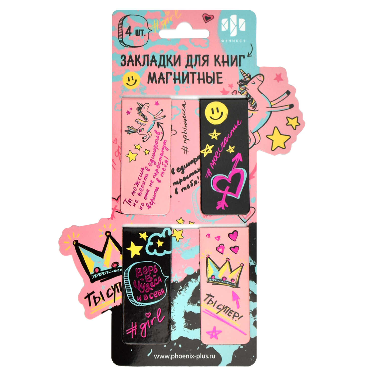 Набор закладок магнитных для книг арт. 67830 / 100 ТЫ СУПЕР! (4 шт. в наборе, размер 25х58 мм, материал: мелованная бумага, ферроагломерированный полимер; цвет: голубой, жёлтый, малиновый, пепельно-розовый, персиково-розовый, персиковый, розовый, чёрный, декор: полноцветный дизайн, тиснение фольгой, особенности: глянцевая ламинация, индивидуальная упаковка: подложка с европодвесом из мелованного картона + ПЭТ-пакет)