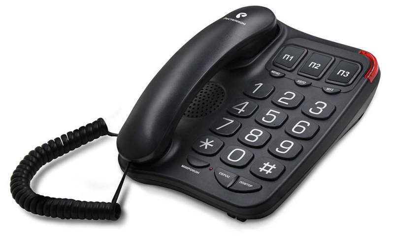 У телефона большой ЖК-дисплей с подсветкой, контрастность которой можно регулировать. Входящий вызывной сигнал сопровождается световой индикацией. На экране аппарата отображаются аналоговые часы, день недели, индикация даты и времени, а также показания встроенного в телефонный аппарат термометра. Определение номера вызывающего абонента (Caller ID FSK/DTMF) с памятью на 35 входящих номеров Громкоговорящая связь (спикерфон) ЖК дисплей Подсветка дисплея Автоматический многократный повтор набора номера (автодозвон) Номер экстренного набора отдельной кнопкой памяти Повтор последних 9 набранных номеров 5 мелодий вызывного сигнала 2 уровня громкости и выключение вызывного сигнала Программируемая пауза Индикация даты и времени Термометр Калиброванный разрыв шлейфа (Flash) от 100 до 1000 мс Возможность кратковременного переключения в тональный способ набора Тональный и импульсный способ набора номера